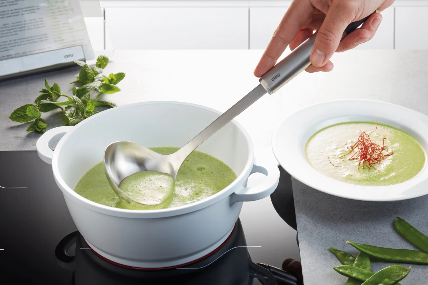 De Gefu Soeplepel Primeline is geschikt voor het portioneren van muffins, wafels of pannenkoekbeslag maar ook van soepen en sauzen. De inhoud van de soeplepel Primeline is 100 ml en is gemaakt van roestvrij staal. De soeplepel heeft een lengte van 33.5 cm. Schep snel en gemakkelijk op met de Gefu Pollepel Primeline!
